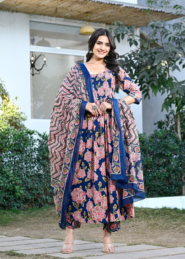 Elevate your style with this stunning Anarkali Suit Set, perfect for any occasion. Crafted from premium 60S Cotton fabric, this outfit combines traditional charm with modern comfort. The A-line Anarkali silhouette is designed to flatter your figure, while the delicate front gathers, pin tucks on the front yoke, and 3/4 sleeves add intricate details to this timeless piece. The round neck adds a classic touch, making it versatile for all seasons.