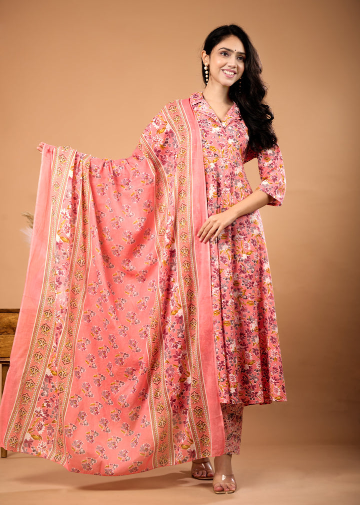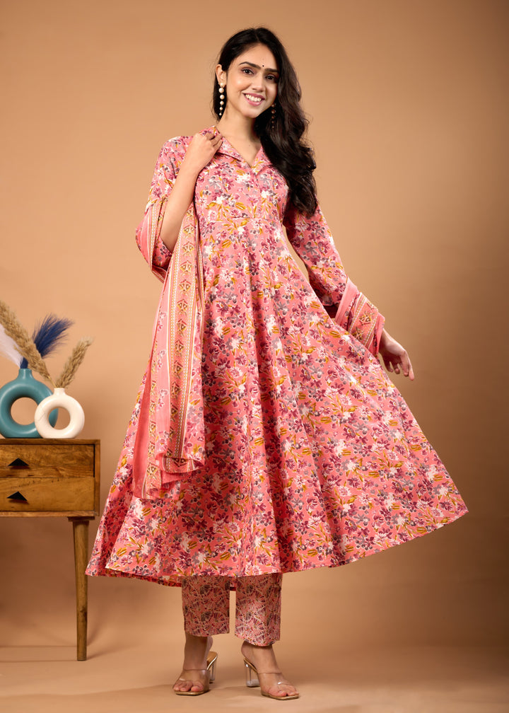 Elevate your wardrobe with this graceful Anarkali Umbrella Suit Set, crafted from high-quality Cotton 60s fabric. Featuring an exquisite Screen Print design, this suit set effortlessly combines traditional charm with modern elegance. The umbrella-style silhouette creates a flowing, flattering look, making it perfect for a range of occasions—from casual outings to festive celebrations.