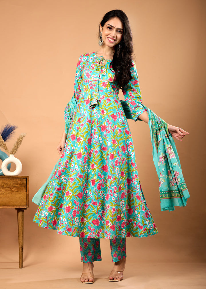 Embrace timeless style and comfort with this stunning Anarkali A-Line Suit Set, crafted from premium Cotton 60s fabric. Featuring a delicate Screen Print design, this suit set offers a perfect blend of tradition and contemporary charm. The flattering A-line silhouette adds elegance, making it ideal for casual outings, festivals, or everyday wear.